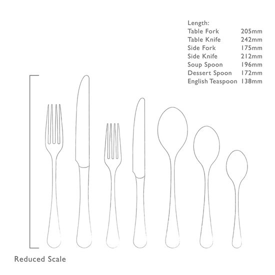 Περιλαμβάνει: Μαχαίρι τραπεζαρίας (6), Πιρούνι τραπεζαρίας (6), Κουτάλι σούπας (6), Μαχαίρι ορεκτικού (6), Πιρούνι ορεκτικού (6), Κουταλάκι επιδορπίου (6), Κουταλάκι τσαγιού (6)