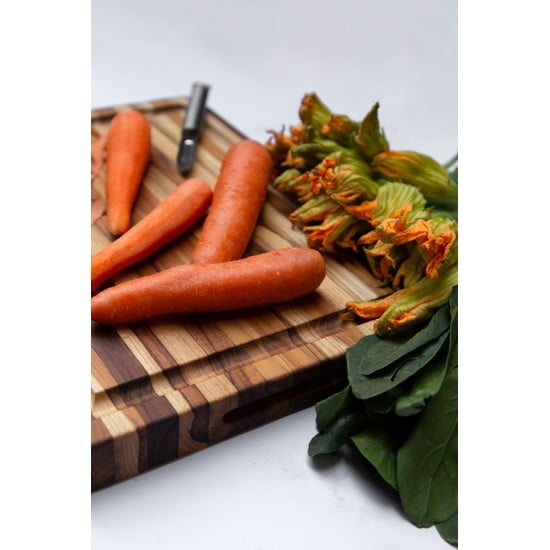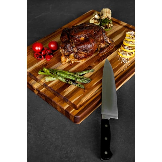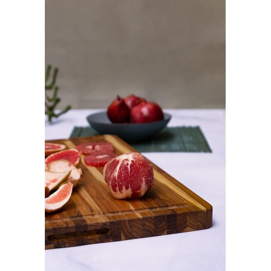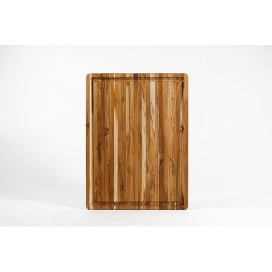 Κατασκευασμένη από επιλεγμένο ξύλο teak με πιστοποίηση FSC, αυτή η μεγάλη επιφάνεια κοπής αποτελεί αγαπημένη επιλογή επαγγελματιών σεφ. Το teak φημίζεται για την ανθεκτικότητα, την αντοχή στην υγρασία και την μοναδική υφή του. Η πλούσια χρυσαφένια απόχρωση και η λεία επιφάνειά της χαρίζουν χαρακτήρα και κομψότητα που θα συνοδεύουν την κουζίνα σας για γενιές.